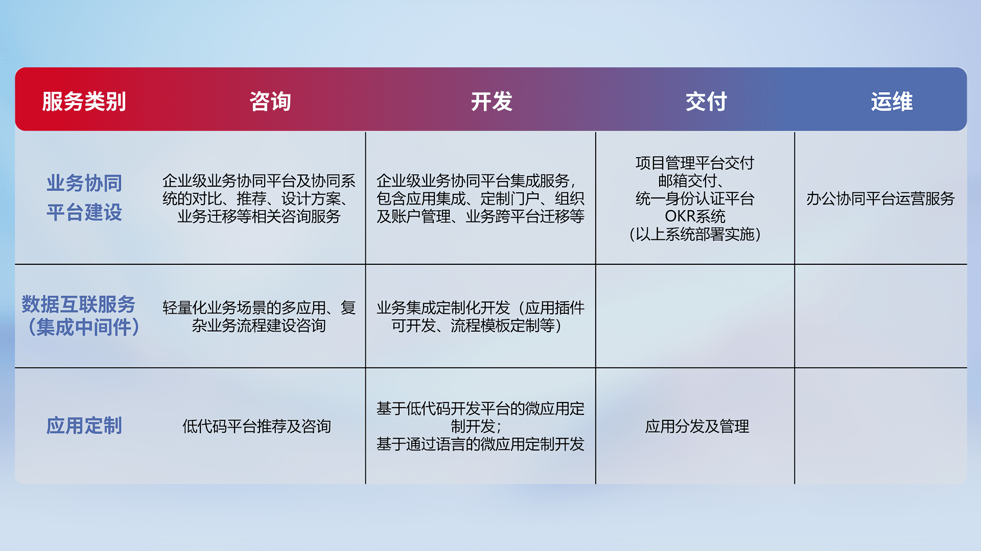 针对钉钉、、企微、、、、IDaas等平台级产品提供产品的规划、、方案、、、交付、、、定制化开发等服务,,,,实现如统一协同办公、、、智能客户服务、、、、混合会议管理、、、智能数据查询、、、、等业务场景,,,,实现数字化转型。。。